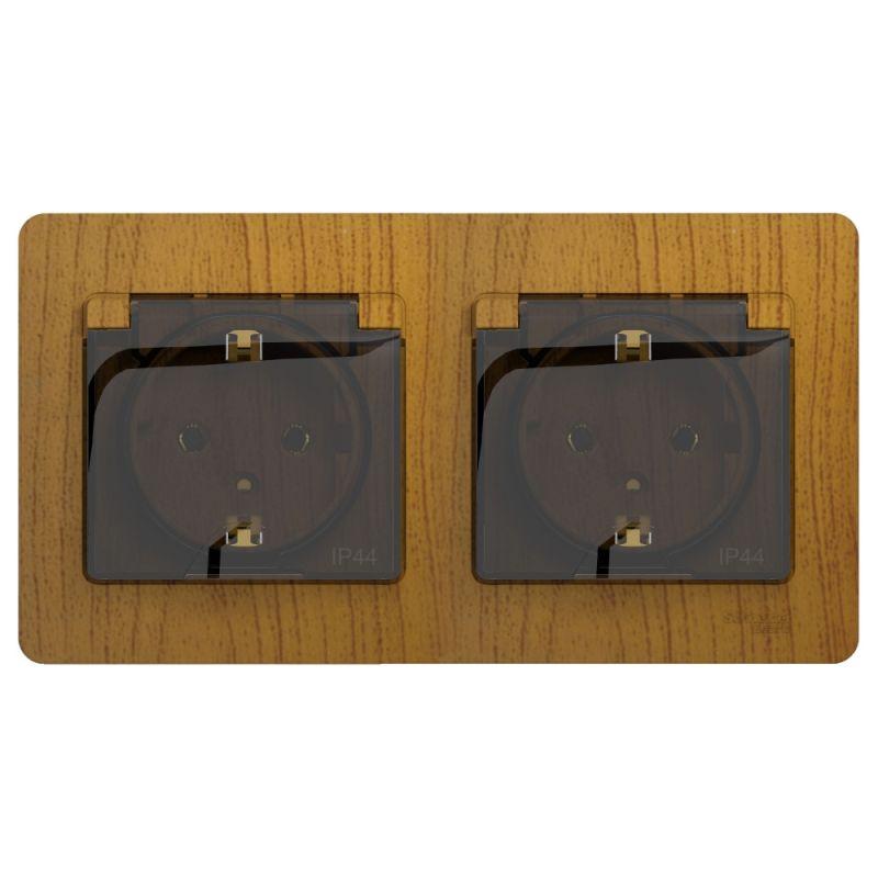 Описание: Розетка 2-м СП 2мод. Glossa 16А IP44 с заземл. защ. шторки в сборе дуб SE GSL000547
