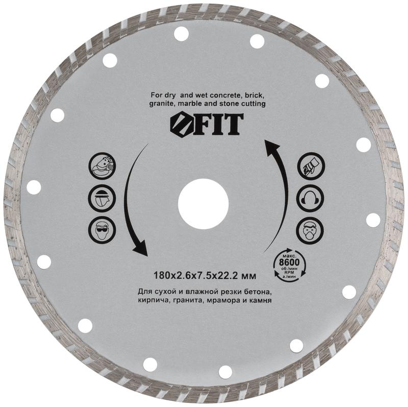 Описание: Диск отрезной алмазный "Турбо" (сухая и влажная резка) 180х2.6х7.5х22.2мм FIT 37475