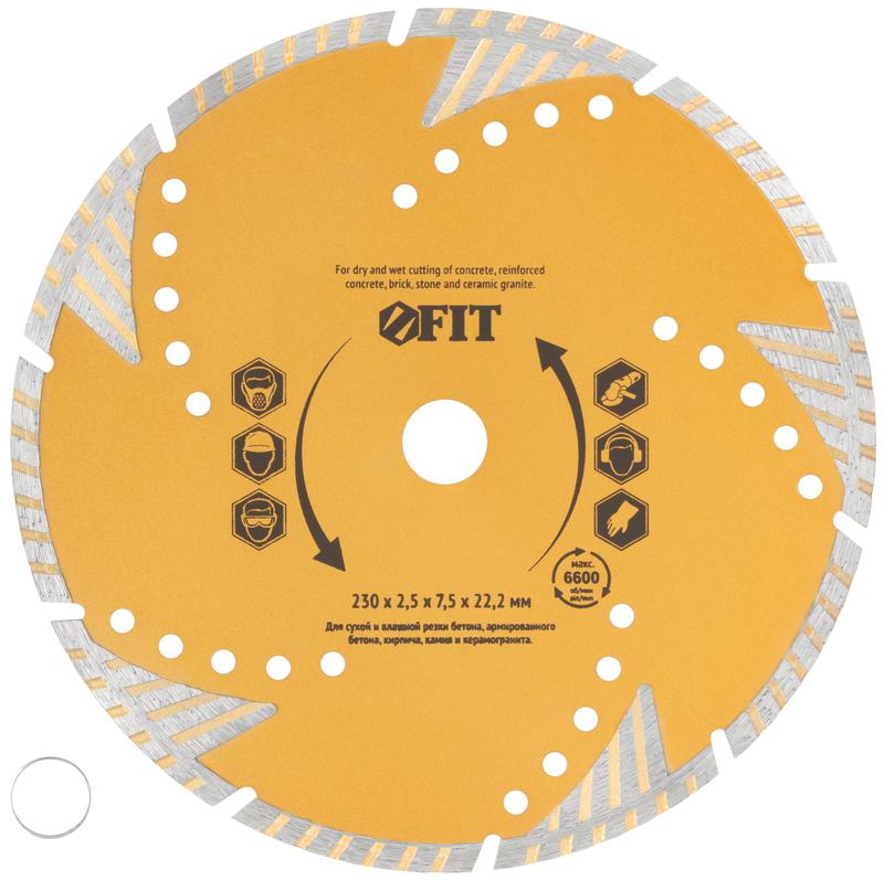 Описание: Диск отрезной алмазный универсальный с защитными секторами (сухая и влажная резка) 230х2.5х7.5х22.2мм FIT 37549