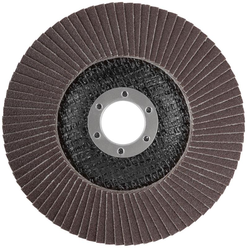 Тип 2 (Конический). 80 лепестков. Для УШМ. Посадочный диаметр 22,2 мм. Абразивный слой из кальцинированного оксида алюминия увеличивает скорость обработки поверхности. Для сухого шлифования и снятия краски с нержавеющей стали, инструментальной стали, чугуна, цветных металлов, пластика и дерева. Материал: абразивный слой - кальцинированный оксид алюминия, основа - х/б ткань, подложка - стекловолокно, обод - инструментальная сталь.