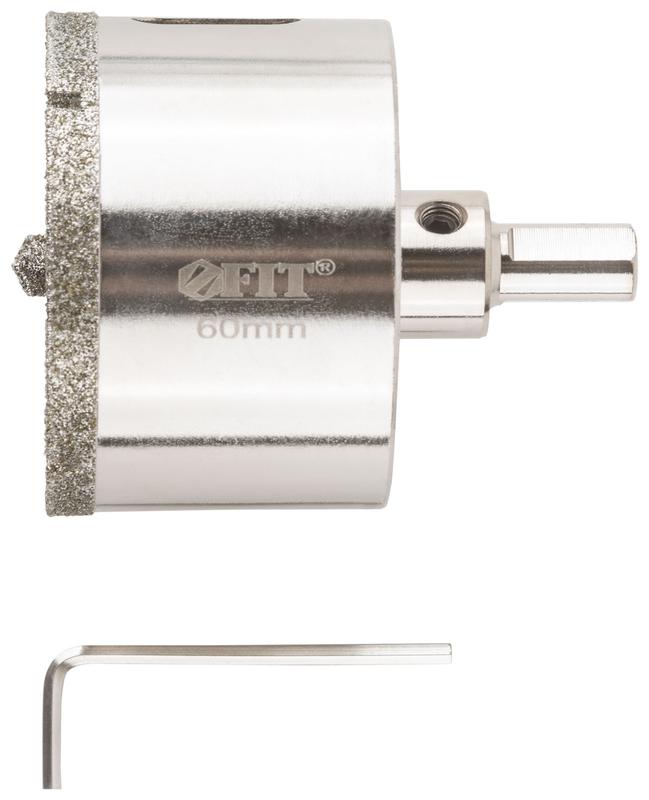 Кольцевая алмазная коронка по керамограниту FIT IT предназначена для вырезания круглых отверстий в керамограните, камне, стекле, кафельной плитке. Поставляются в комплекте с центрирующим сверлом и шестигранным ключом. Влажное сверление. Высокая концентрация алмазного зерна обеспечивает износостойкость и длительный ресурс коронок. Чистый рез без сколов достигается за счет мелкого размера алмазных частиц. Центрирующее сверло предотвращает смещение коронки во время работы и способствует точному позиционированию. Трехгранный хвостовик передает больший крутящий момент за счет стойкости к проворачиванию.