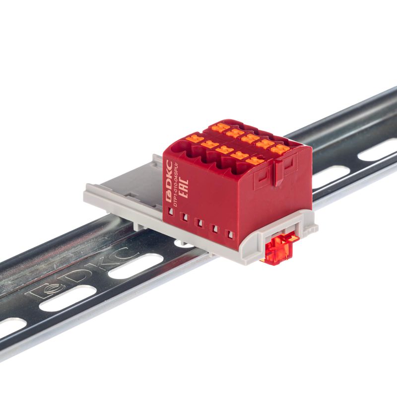 Блок распределительный с вертикал. адаптером на рейки шир. 15/35мм зажим push-in 10 точек подключения 2.5кв.мм красн. DKC DTP1-010-04SPUR-V - способы оплаты