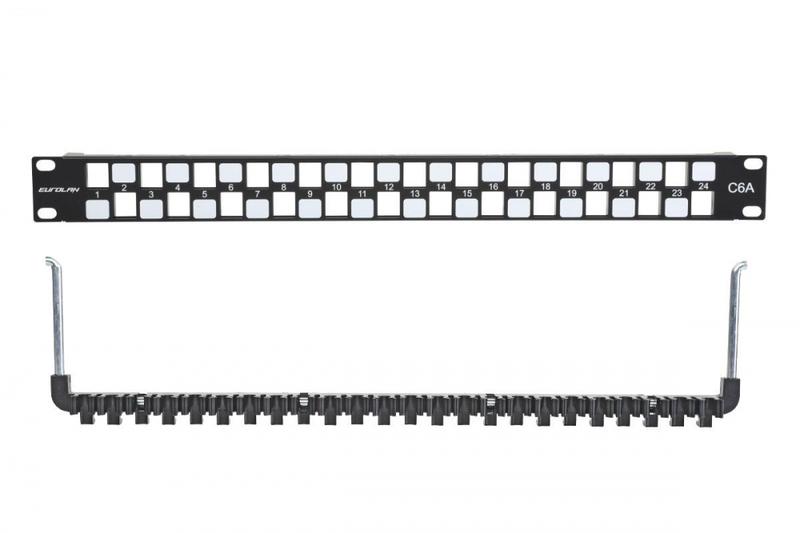Описание: Патч-панель 19дюйм наборная UTP 6A 1U 24 порта черн. Eurolan 27B-00-24BL-UA