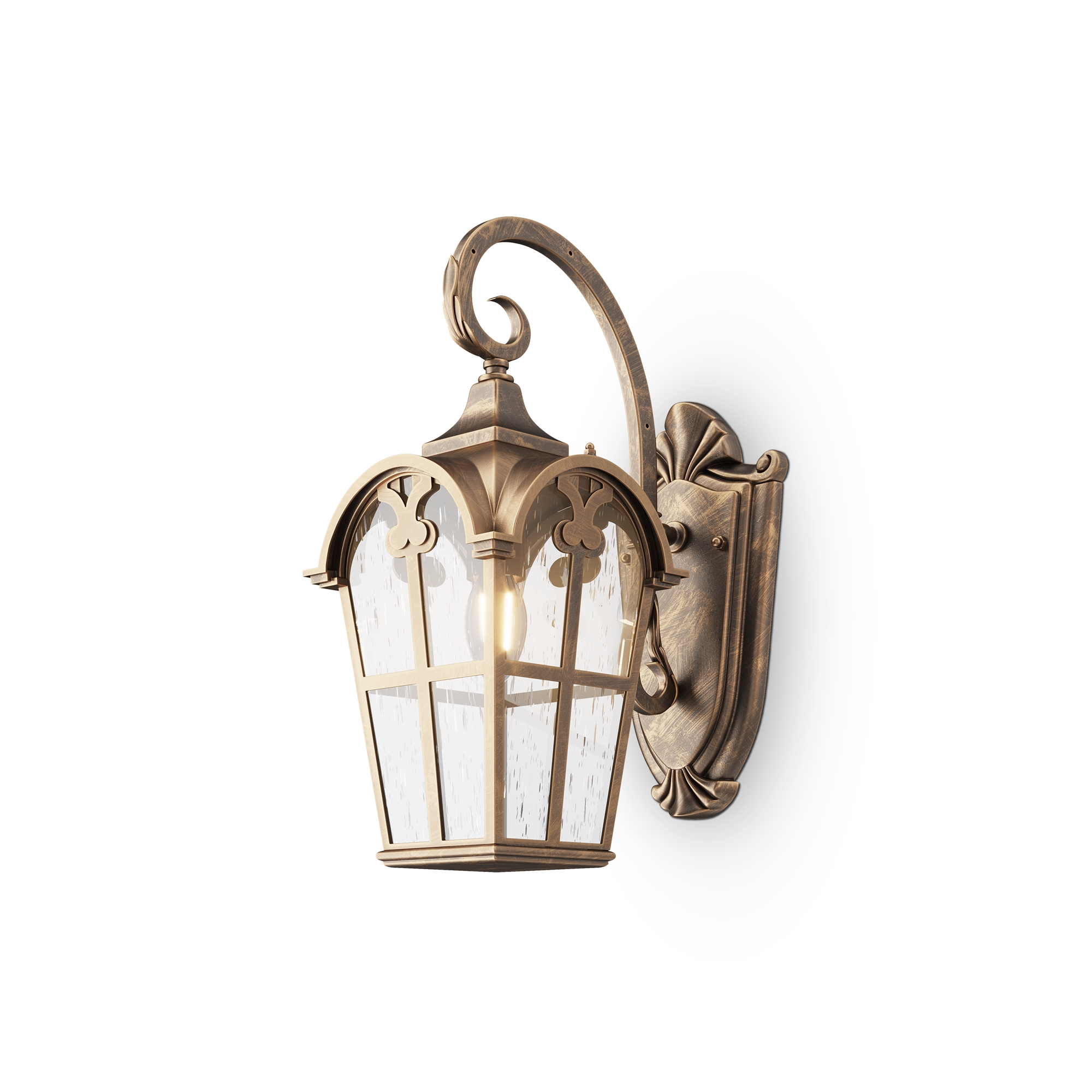 Широкий ассортимент серии включает настенные, подвесные и напольные светильники. Алюминиевый корпус моделей не подвержен коррозии и устойчив к перепадам температур. Волнистое стекло плафона обеспечивает красивые световые узоры. Модели представлены в двух цветах: античная бронза и черный с золотом. Источник света – лампы с цоколем Е27.
