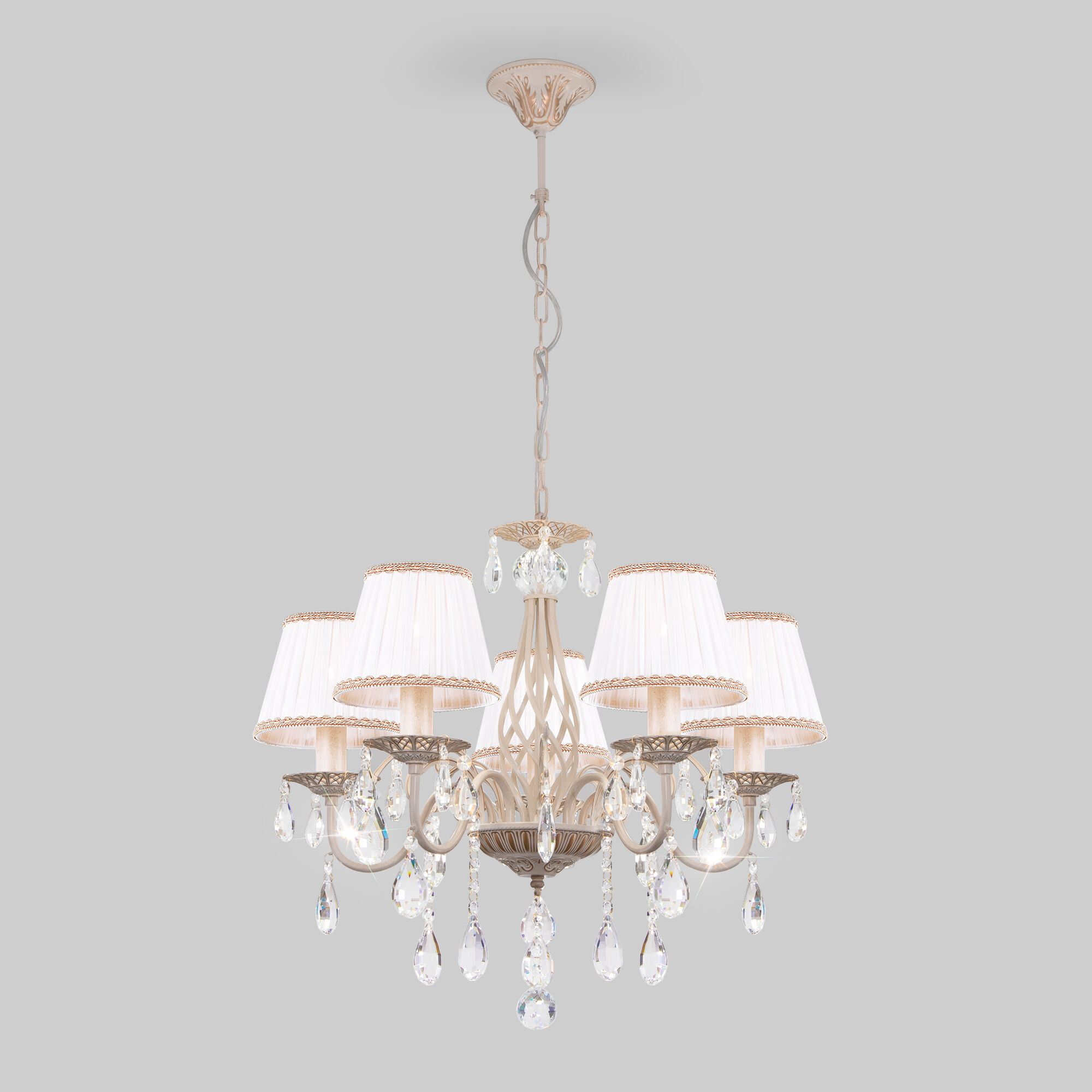 Описание: Люстра с тканевыми абажурами и хрустальными подвесками 10054/5 белый с золотом 00000077237 Eurosvet