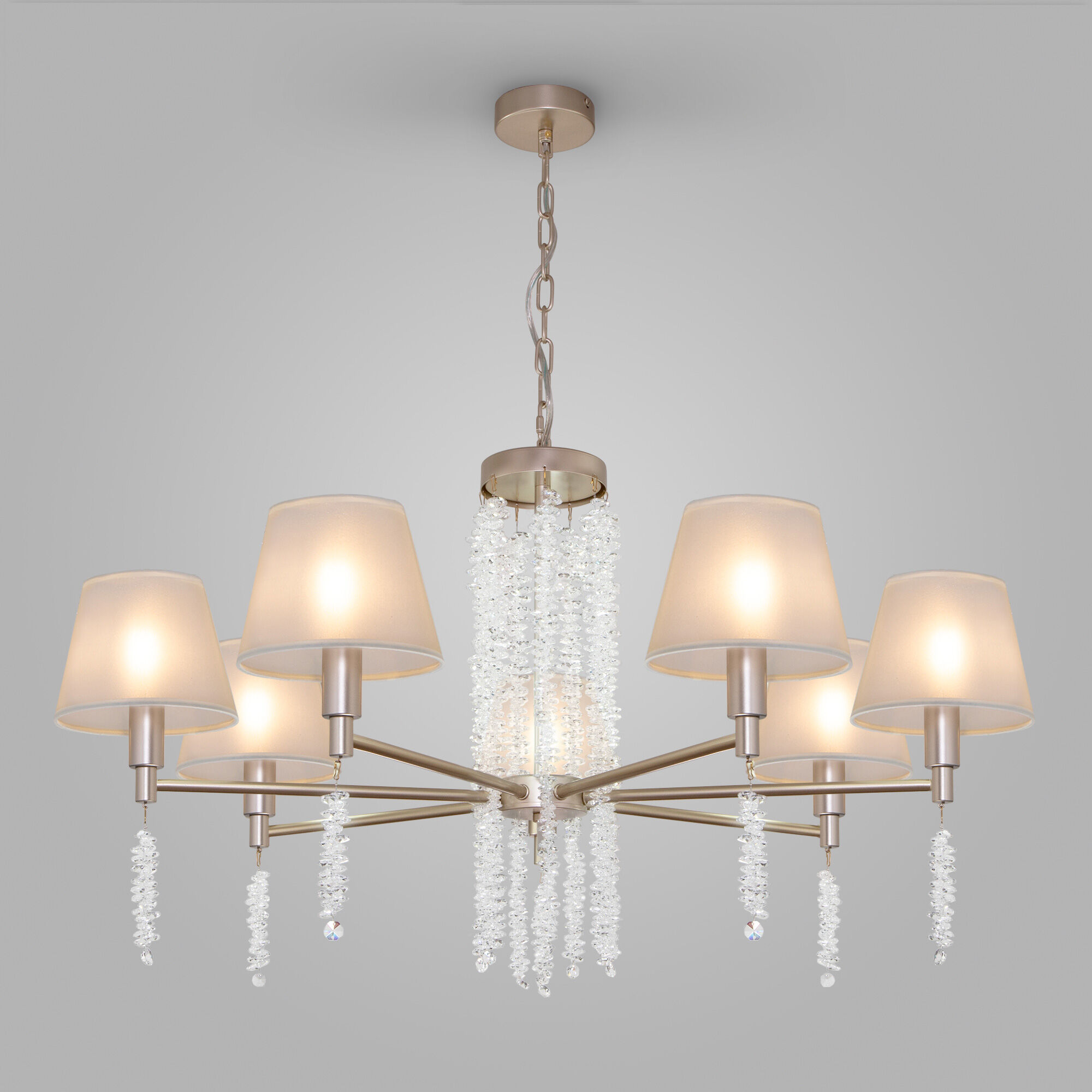Создать качественное освещение вам поможет классическая подвесная люстра с тканевыми абажурами. Простые минималистичные формы и сдержанные тона станут идеальным дополнением для вашего интерьера. Люстра украсит потолок вашей спальни и создаст полноценное освещение на площадь 13 м².