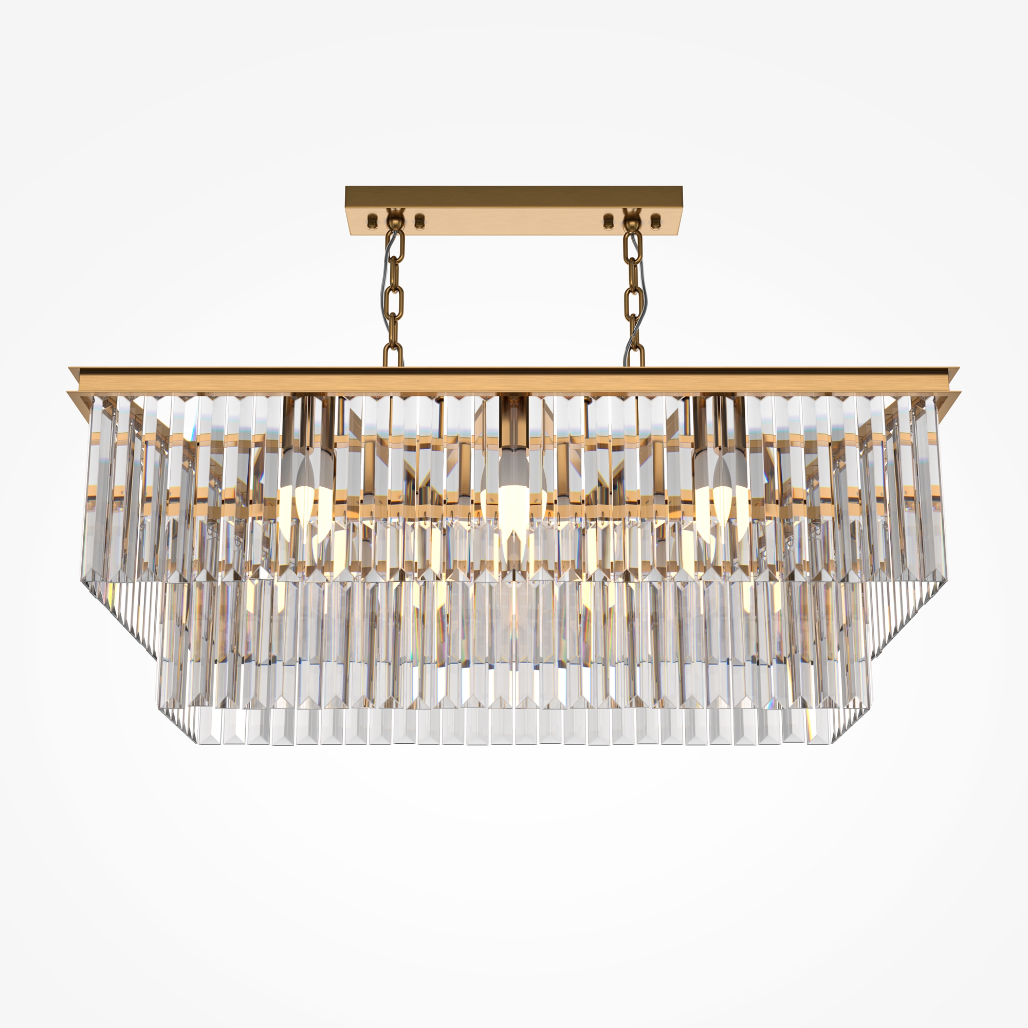 Арматура из металла в трех оттенках: латунь, хром, золото. Многоярусный декор. Подвески: прозрачное (арматура – хром, латунь) и янтарное (арматура – золото) стекло. Высота подвесных моделей регулируется.