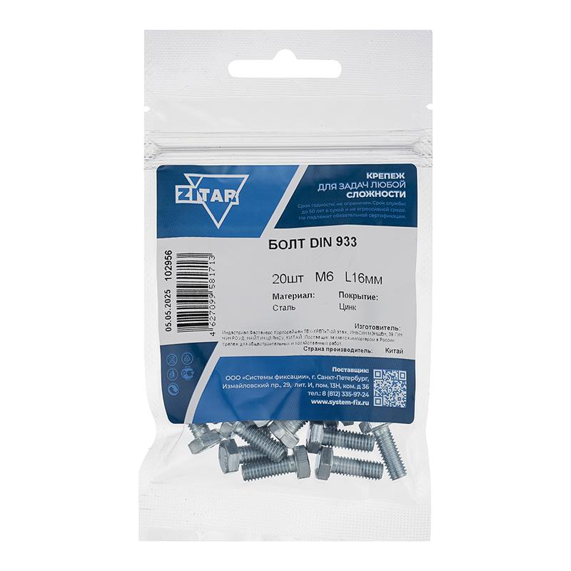 Описание: Болт с шестигранной головкой М6х16 DIN 933 класс прочн. 8.8 оцинк. пакет (уп.20шт) Tech-KREP 102956