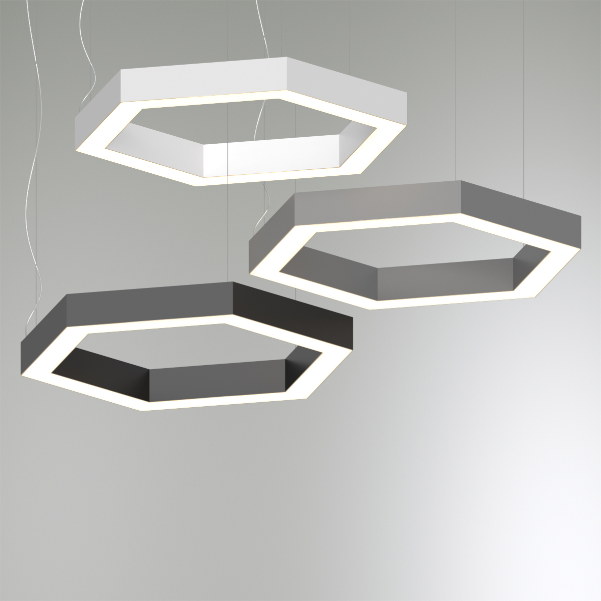 Подвесные светодиодные светильники серии RVE-LBX. Цена за светильник без покраски, цвет корпуса алюминий. Дополнительно можно заказать покраску в любой цвет, диммировние, аварийный блок питания, RGB и RGBW свечение. RVE-LBX-HOLE-HEXA-800-P (шестиугл. с отв. 800x693x100мм S80мм 54Вт 4000K черный ) светильник имеет мощность 54 вт, цвет свечения Нейтральный белый 4000K.