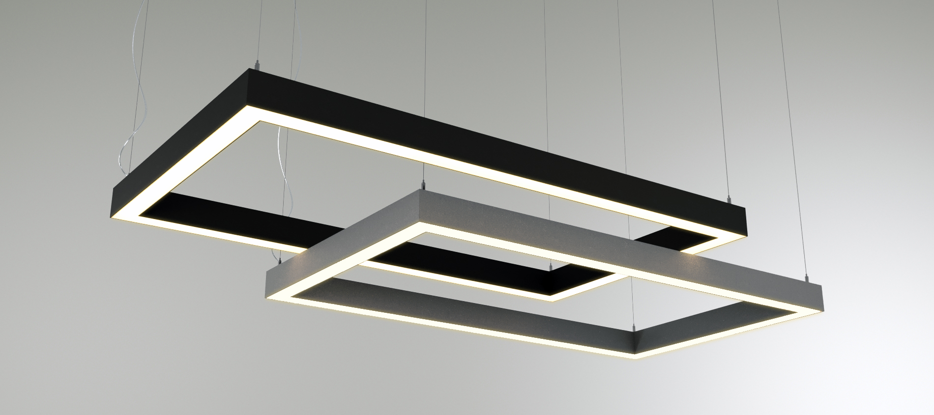 Подвесные светодиодные светильники серии RVE-PLS5070 (фигурные). Цена за светильник без покраски, цвет корпуса алюминий. Дополнительно можно заказать покраску в любой цвет, диммировние, аварийный блок питания, RGB и RGBW свечение. RVE-PLS5070-CUADRO-1921-P (прямоуг. 1921x983мм 50x70мм 144Вт 5000) светильник имеет мощность 144 вт, цвет свечения Холодный белый 5000K.